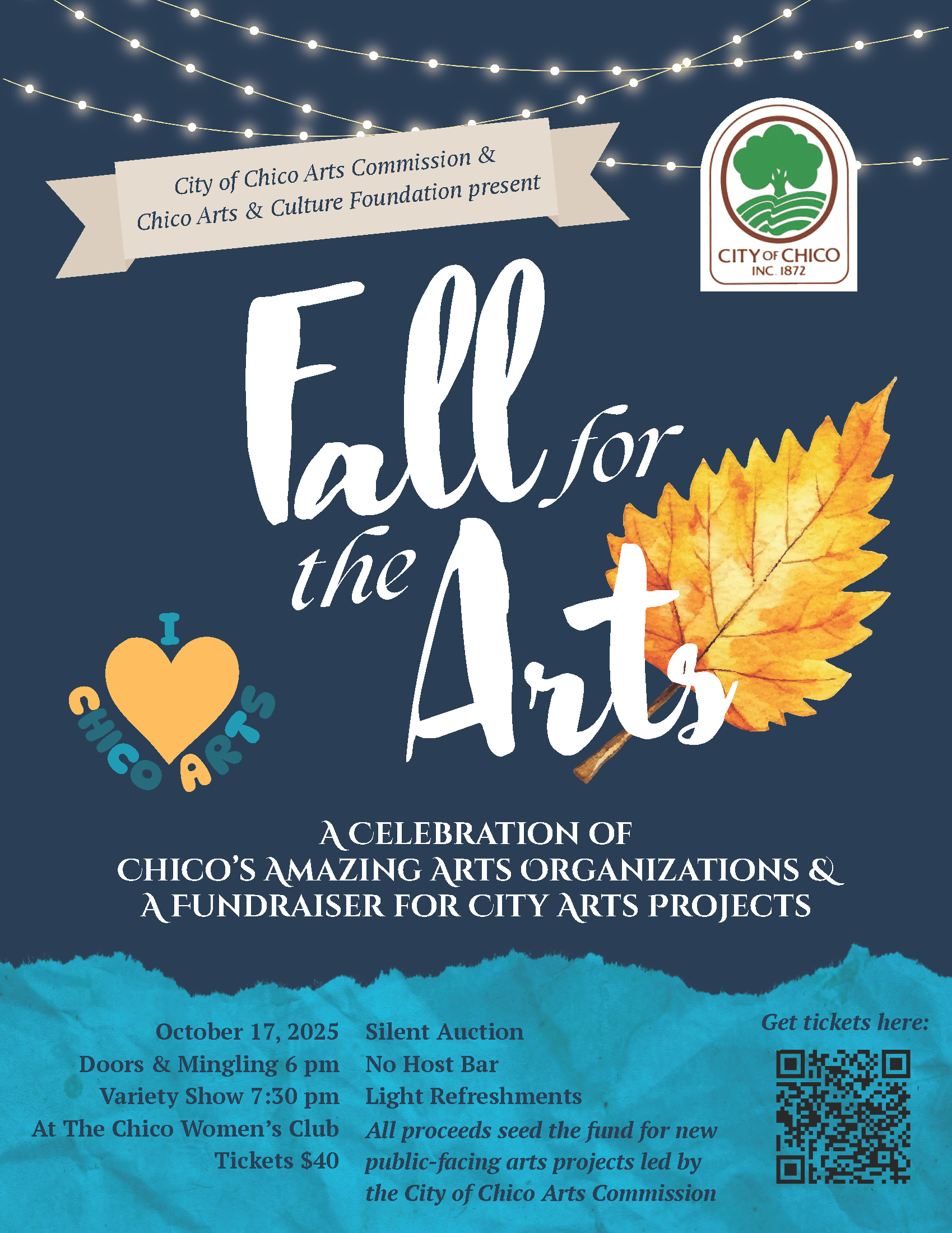 Fall for the Arts will take place on Friday, October 17th at the Chico Women’s Club, located at 592 E. 3rd Street Doors open at 6:00 PM. Fall for the Arts is a fundraiser for the Chico Arts Commission— supporting creative initiatives that bring art to the heart of our community. Tickets are $40 and can be purchased at www.chicoca.gov/arts-commission. Guests can expect: • A raffle with artwork by local artists and baskets from local businesses • Live souvenir T-shirt printing with Pedal Press (bring your own light-colored shirt!) • Light refreshments & a no-host bar • Presentation of the 2025 Mayor’s Achievement in the Arts Awards “Fall for the Arts is a celebration of Chico’s creative community & a fundraiser for public art projects; we have lots of fun things planned” said Arts Commission Chair Bonnie Pipkin.” The event will include creative contributions from MONCA (Museum of Northern California Art), 1078 Gallery, Chico Art Center, Friends of the Chico Community Ballet, Stonewall Alliance, Inspire School of the Arts, The Blue Room Theater, Upstate Community Enhancement Foundation, Pedal Press, and Legacy Stage. The evening will culminate in a lively Variety Show highlighting the talents of Chico’s rich arts scene. Located in Butte County, California, Chico is the cultural and economic center of the northern Sacramento Valley and the largest city north of Sacramento. Known as a college town, the home of California State University, Chico and for Bidwell Park, one of the largest urban parks in the United States. For more information, visit www.chicoca.go